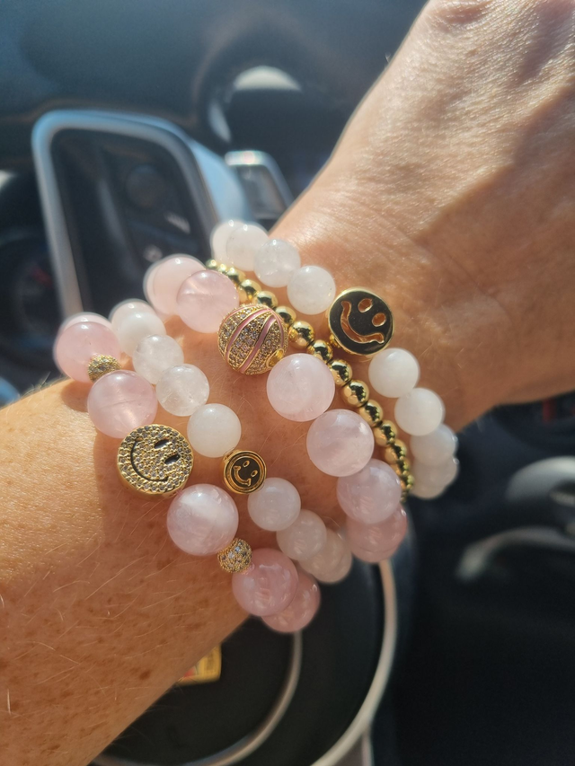 zartes Armband aus 8 mm großen Jadeperlen in weiß, elastisch mit einem kleinen Smiley und einer ebenfalls 18k vergoldeten Zwischenperle. Armband kann mit Smiley oder Zwischenperle vorne getragen werden - beidseitig tragbar