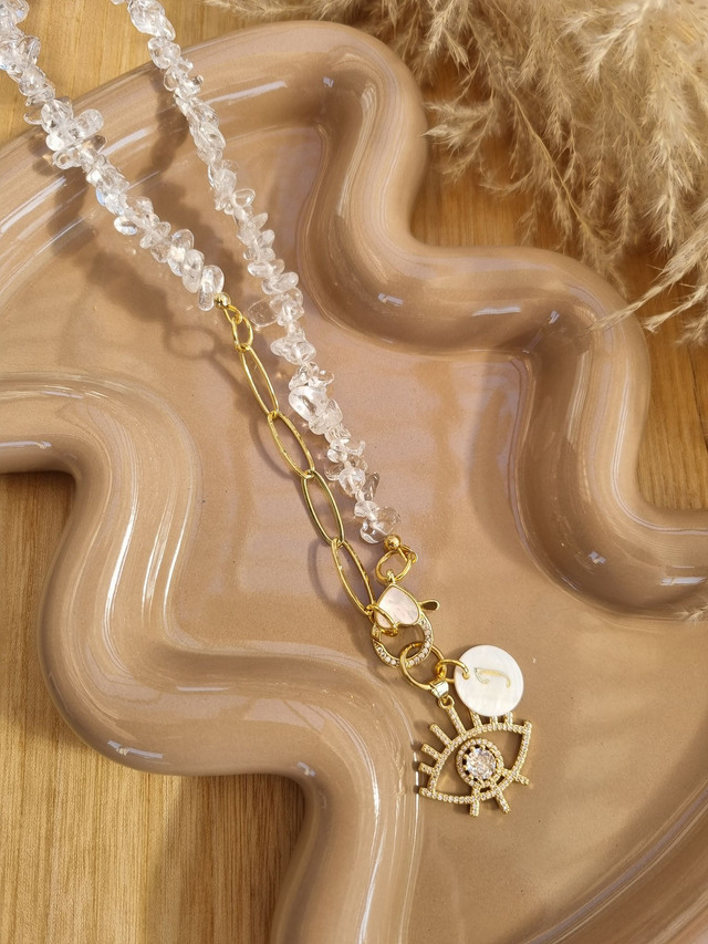 Bergkristall-Kette, gefädelt mit Perlmutt-Verschluss, Premium Eye-Charm und Perlmutt-Inital-Charm