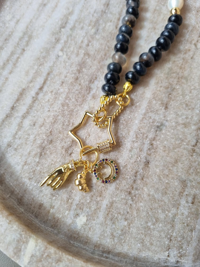 Handgeknotete Edelsteinkette aus Black Opal in Rondellenform mit eingearbeiteter Süsswasserperle
