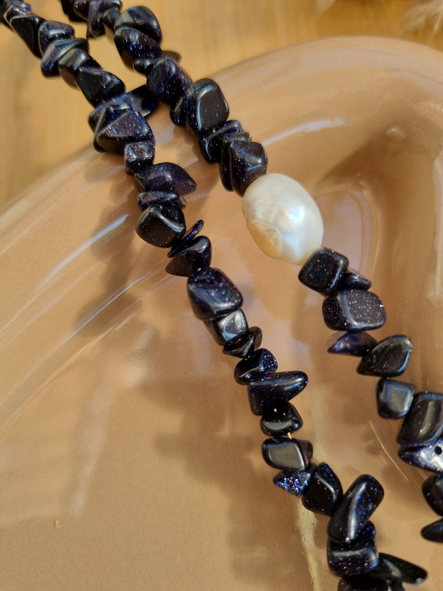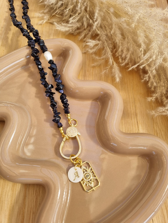 Blaufluss-Kette, gefädelt, mit einer Süsswasser-Barockperle als Highlight dazwischen und dem absoluten Knaller-Zirkonia-Pave-Karabiner samt zauberhaftem Eye-Charm und Perlmutt-Charm mit Inital.