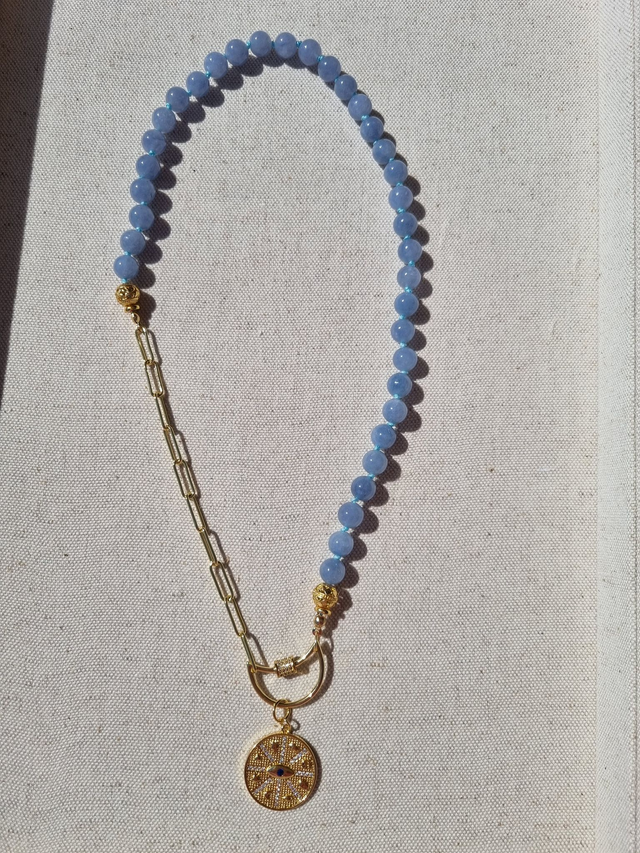 handgeknotete Kette aus blauer Jade mit Paperclip-Kettenelement, Mond-Verschluss und Eye-Anhänger