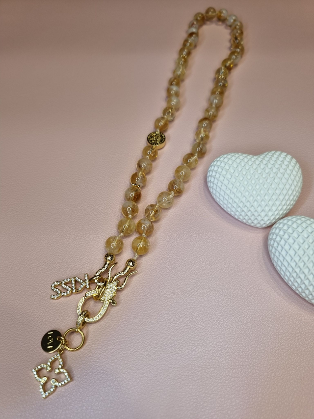 Handgeknotete ILVIE GEMS aus Citrin-Perlen mit Charms, wording "kiss", Blume mit Zirkonia und Love-Charm