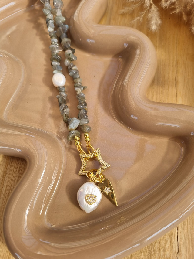 Labradorit-Splitterkette, gefädelt mit einer Süsswasser-Barokperle als Highlight dazwischen.