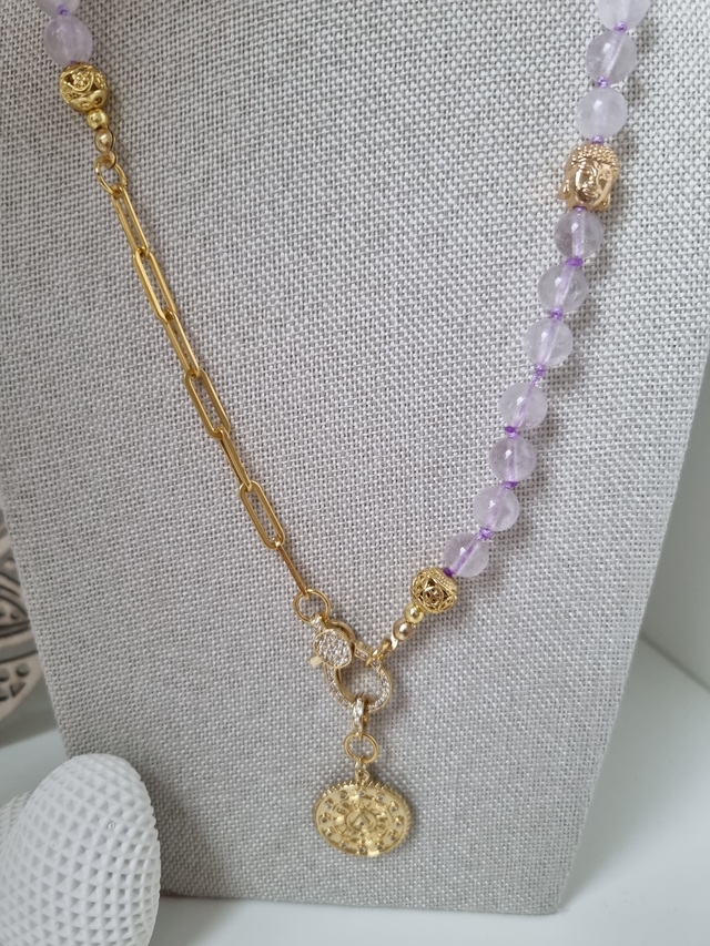 Handgeknotet mit hochwertig vergoldeten 18k Paperclip-Elementen und einem ganz besonderen Zirkonia-Verschluss mit Sonnen-Anhänger. Unter die Lavendel-Amethyst-Perlen hat sich ein süsser Buddha geschmuggelt.