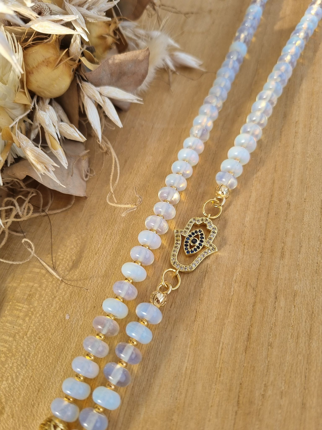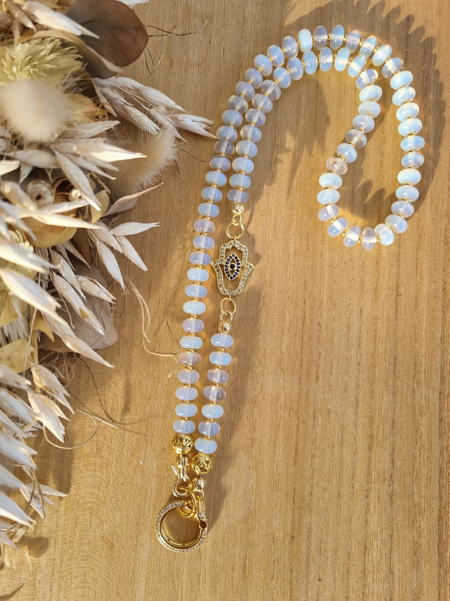 Ein ganz besonderes Unikat - eine Kette aus Regenbogen-Mondstein in Rondellenform. Ausnahmsweise nicht geknotet sondern gefädelt mit minikleinen, 18k vergoldeten Zwischenperlen. Als Highlight eine Pave-Zirkonia Hamsa-Hand und ein ganz besonders schöner Verschluss.
