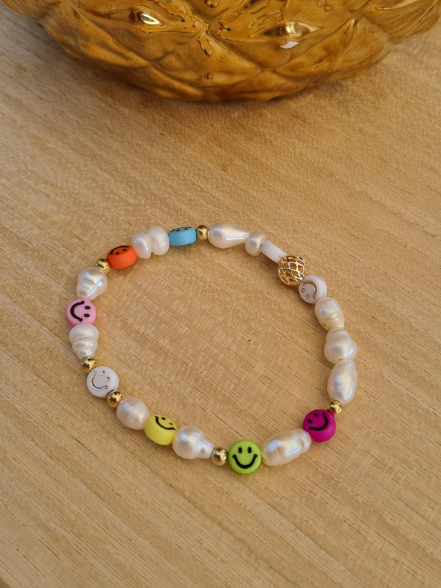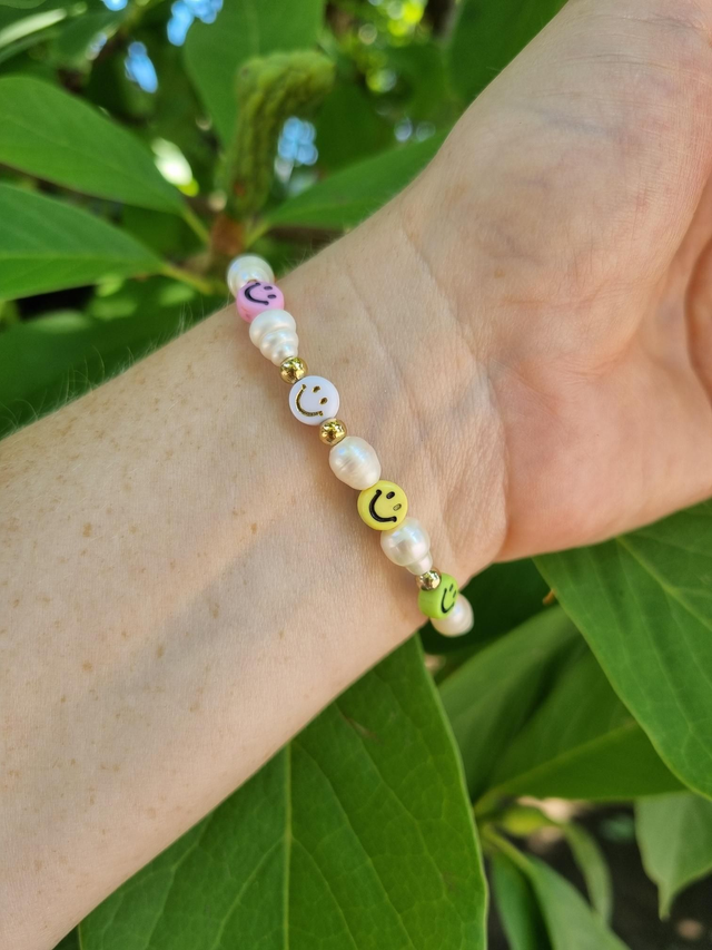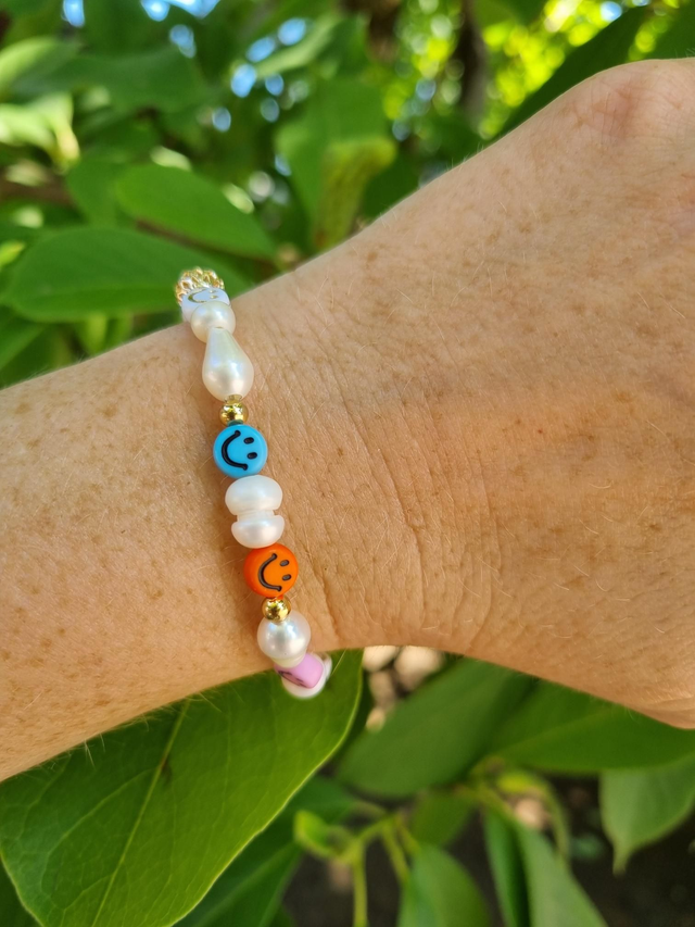 Elastisches Armband aus Süsswasserperlen und Smileyperlen.